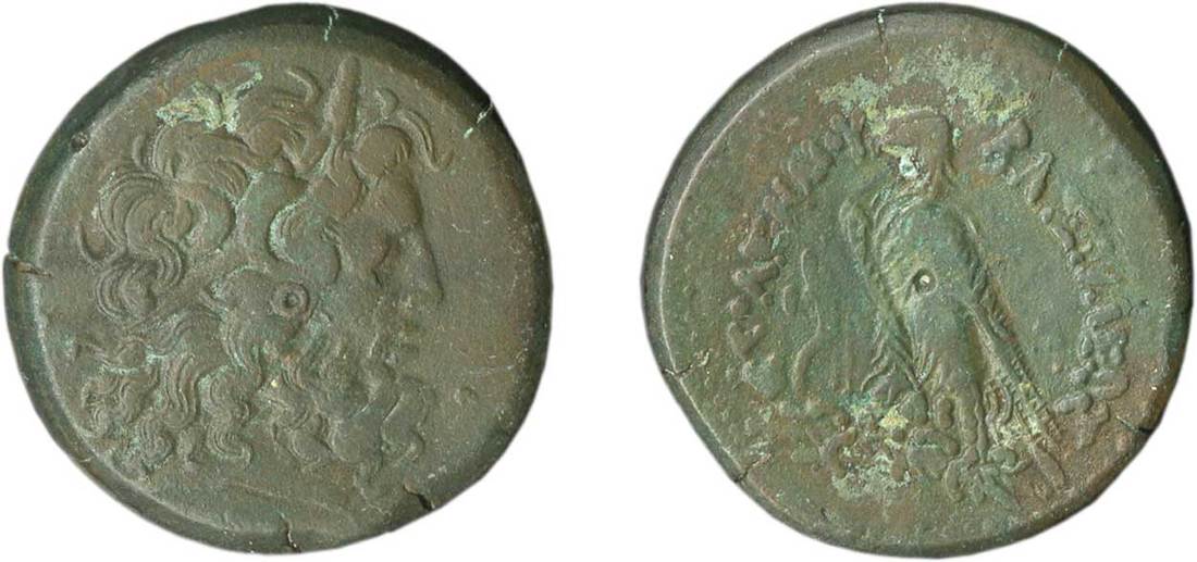 Kings of Egypt. Ptolemy IV Philopator (221-205/4 BC). AE Drachm. First series. Alexandria. 41.5mm. Head of Zeus-Ammon r. wearing tainia, rev.. Eagle standing l. on thunderbolt, filleted cornucopiae before, ?I between legs. Svoronos 1125, SNG Copenhagen 199. Deep olive-brown, light earthen hues. Very Fine.