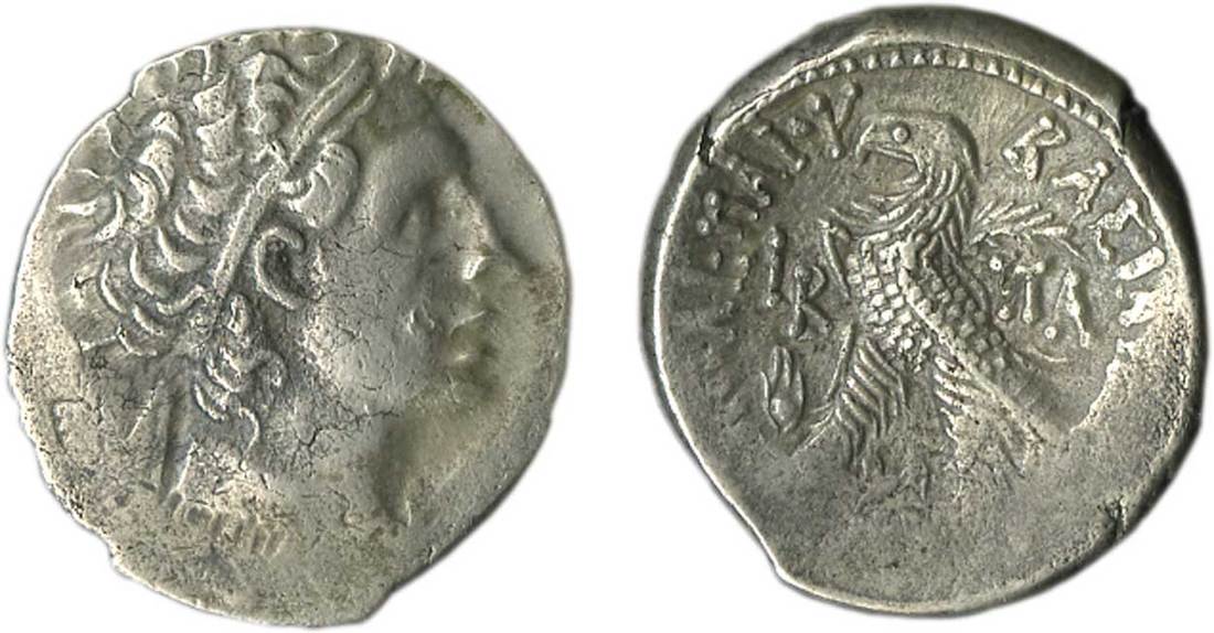 Kings of Egypt. Cleopatra VII (51-30 BC). AR Tetradrachm. Alexandria, regnal year 2 (51/50 BC). 14.03 gms. Diademed Ptolemy head r., rev. Eagle standing l., palm over shoulder, atop thunderbolt, date LB above Isis headdress in left field, ?A in right. Svoronos 1817, SNG Copenhagen 398. Minor weakness of strike lower edge. Light gray. Very Fine.