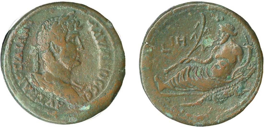 Roman Provincial. Hadrian (117-138). AE Drachm of Alexandria, regnal year 18 (133/4 AD). 33.5 mm, 27.5 gms. AVT KAICT TPAIAN-A?PIANOC CEB, Laureate, draped bust right, rev. Nilus reclining left, holding reed and cornucopiae, date LIH before. Milne 1423var.Reddish-brown patina with earthen green hues. About Very Fine.