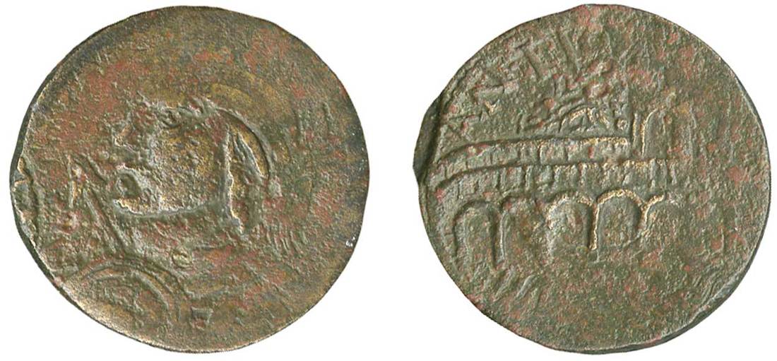 Roman Provincial. Gallienus (253-268). AE Medallion of Antiochia ad Maeandrum in Caria, ca. 260 AD. 35.6 mm, 21.19 gms. Helmeted and cuirassed bust left, holding spear and shield, rev. ANTIOXE-?N, Bridge with six arches and side guards over the Maeander River, triple-bayed triumphal arch at one end, rivergod Maeander reclining above top side wall. SNG von Aulock 8059, SNG München 92. Rare. Peripheries not struck up. Deep olive-brown with burgundy hues. Fine-About Very Fine.