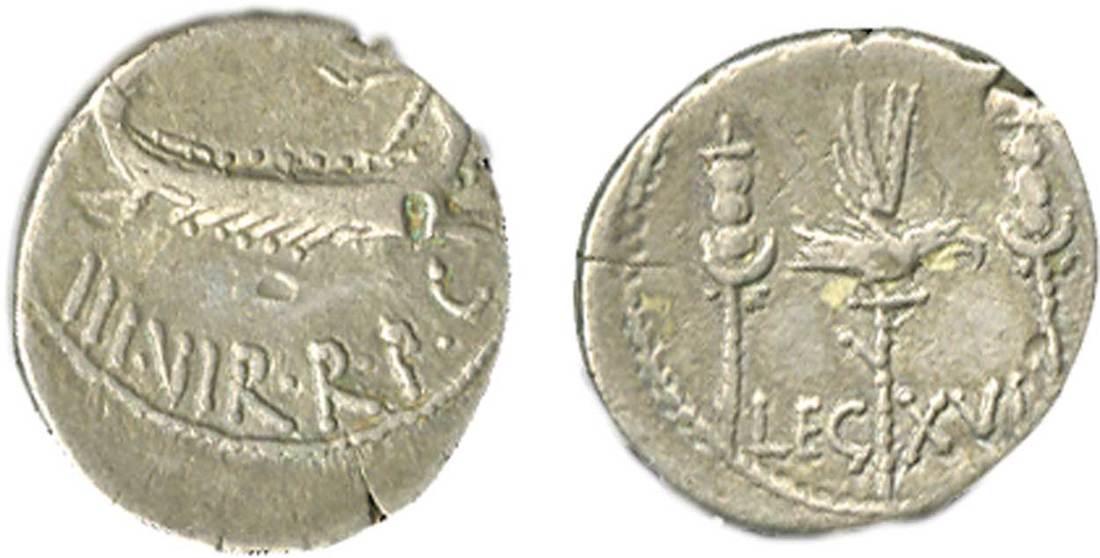 Roman Imperatorial. Mark Antony. AR Legionary Denarius, autumn 32-spring 31 BC. Patrae? mint. Legion XVI. 3.68 gms. (ANT. AVG) III.VIR.R.P.C., praetorian galley, rev. LEG XVI. Craw.544/31, Syd.1236. Medium gray over light test Xs in field. Very Fine.