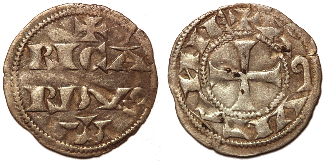 Anglo-Gallic. Richard, "Coeur de Lion", as Duke (1172-1185). Aquitaine. Denier. 0.69 gms. RICARDVS in two line, cross above. omega below, rev. Cross pattée within inner circle. Galata 5-(1/a), Elias 4, S.8004, B.471, Poey d'Avant 2767-8, Dup.1033. Very Fine.