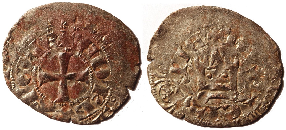 Anglo-Gallic. Edward III (1327-1362, 1372-1377). Gros au châtel aquitanique. 1.6 gms. Cross pattée within inner circle, rev. Châtel aquitanique within tressure of 12 arcs. Galata 67C-(3/e), Elias 61a var (RRR), S.8058, B.486, Poey d'Avant 2855, Dup.1065. Very rare subtype. Burgundy-red earthen deposits obverse. Typical crude strike. About Very Fine. Ex Joffre collection, Triton XVIII sale, Jan. 6-7, 2015, lot 1803.