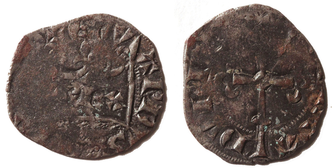 Anglo-Gallic. Edward III (1327-1362, 1372-1377). Black coinage. Double à la couronne. 1.20 gms. Imitating the Double Tournois of Philippe VI, emission 3 January 1348 (Dup.272). Large crown, REX inscribed upon it; +EDV?RDVS.A(NGLIE), rev. Cross calvary, limbs terminating in open trefoils, lower limb divides legend; (+MON)ETA-DVPLEX. Galata 107B-(2/b), Elias 89 (RR), S.8086, B.499, Poey d'Avant 2885, Dup.1087. Very Rare, and much rarer than Elias indicates, this specimen is the first offered in public auction since the Elias sale in 1990. Some flatly struck areas. Deep gray. Very Fine.