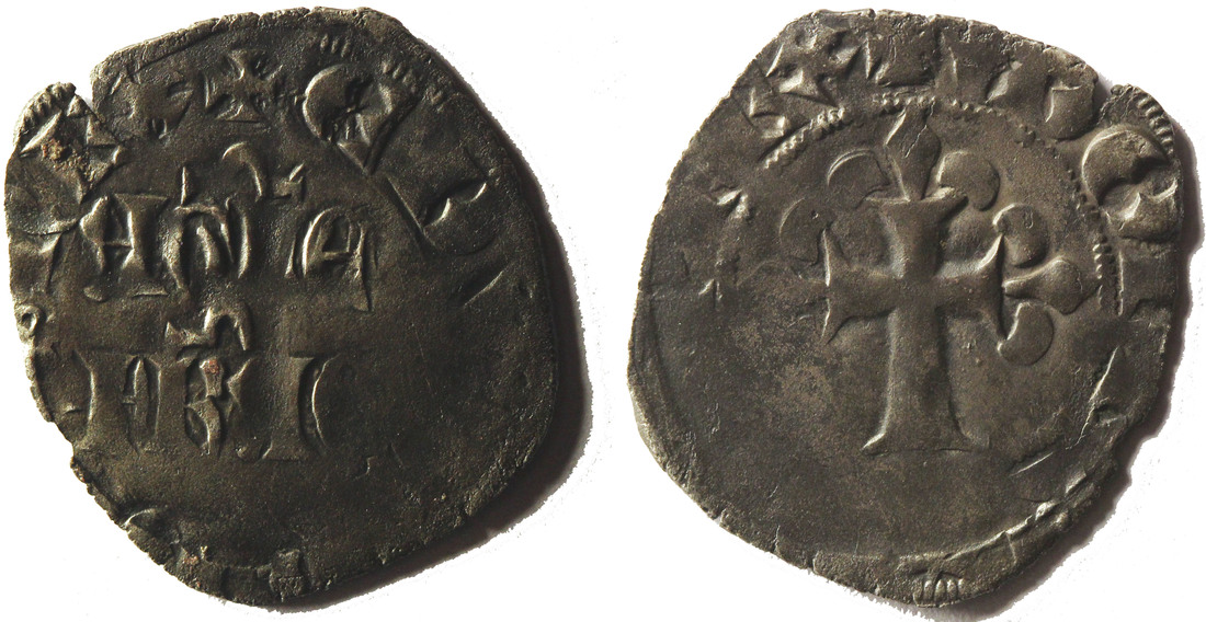 Anglo-Gallic. Edward III (1327-1362, 1372-1377). Black coinage. Double. 1.35 gms. AGLE FRAC in two lines in field, stretched omega above and below; +EDVV(?R)DVS:REX (annulet stops), rev. Cross calvary within inner circle, three upper limbs ending in fleurs; +MONETA: D(VP)LEX. Galata 109 (where it is classified as Aquitaine), Elias 124 (RRRR), S.8087, B.--, Poey d'Avant--, Dup.--. Elias notes that this type was closely imitated in Bergerac, thus is likely to have been struck in Aquitaine. Some weakness, but overall sharp strike. Very Fine and Very rare. This is only the second specimen offered in public auction, and compares most favorably with the Joffre specimen which sold for $4,800 at Triton.