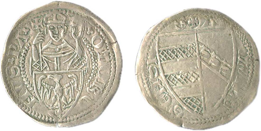 Italian States. Aquileia. Ottobono dei Robari (1302-1315). Denaro. 1.10 gms. Patriarch enthroned facing, shield with eagle before; OTOBO-NVS PA (three-leaf clovers divide legend), rev. Shield with Arms. Bern.34. Good Very Fine.