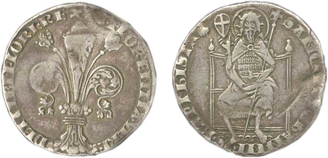 Italian States. Firenze. Repubblica (1189-1533). Grosso guelfo da 5 soldi, (1347 - 1st semester). 2.80 gms. Florentine fleur-de-lis; DE + TIBI.FLORERE XPS. FLORENTIA.VERE, rev. St. John the Baptist seated holding cross and orb, moneyer's symbol with conch shell (for Nadozzo di Naddo) +SANCTVS.IOHANNES.BAPTISTA. Bern.1545. Very rare. Toned over old test mark or flaw from reverse edge and obverse hairline. Very Fine.