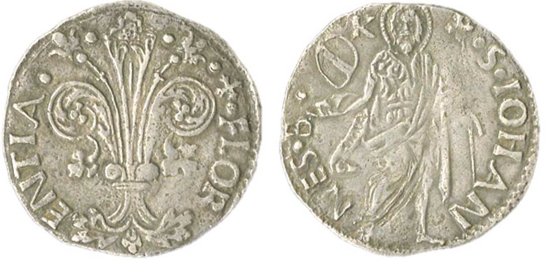 Italian States. Firenze. Repubblica (1189-1533). Grosso guelfo da 8 denari (1483 - 1st semester). 2.17 gms. Florentine fleur-de-lis; .+.FLOR-ENTIA., rev. St. John the Baptist standing facing, moneyer's symbol with "K" (for Cante di Giovanni Campagni) .S.IOHAN-NES.B. Bern.3271. Very Fine.