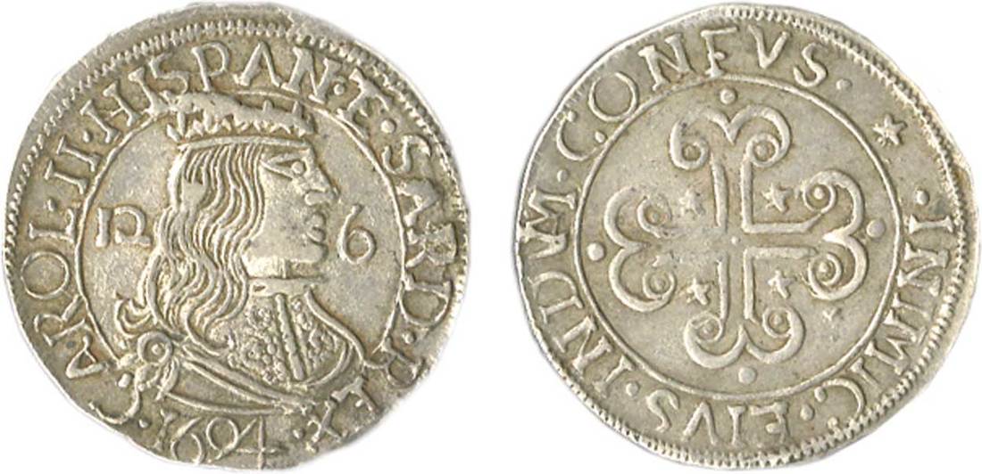 Italian States. Sardinia. Carlo II di Spagna (1665-1700). 2 ½ Reali, 1694. Cagliari. Crowned bust r. dividing 12-6, rev. Ornate cross ancrée, stars in angles, pellets on ends. CNI II, 55; MIR 86/1. Single obverse hairline revealed under magnification otherwise Choice Very Fine.