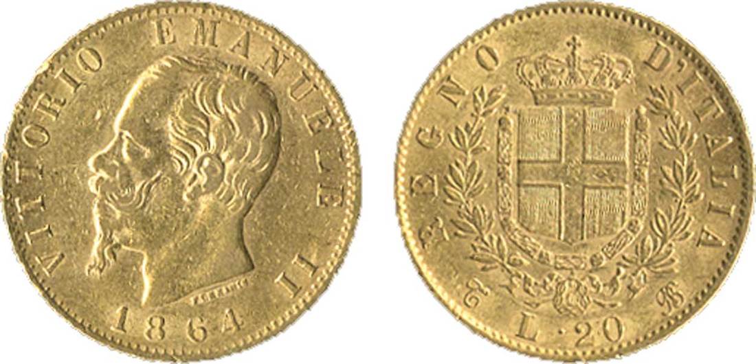 Italy. Kingdom. Vittorio Emanuele II (1861-1878). 20 Lire, 1864 T BN. Torino. Head l., rev. Crowned Arms, in spray, of the fledgling united kingdom. Fr.11, KM 10.1. Some rim tics. About Very Fine.