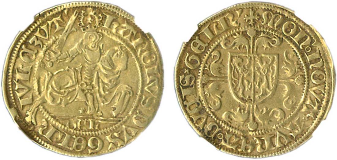 Netherlands. Gelderland. Karel van Egmond. (1492-1538). Florin, nd. Knight in full armor charging right on war-horse, sword arm raised, rev. Shield with arms on floriated cross. Fr.68. NGC XF 45.