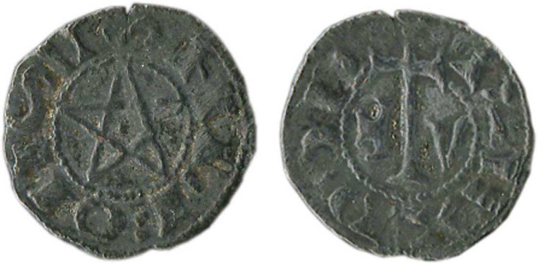 Portugal. Dom Afonso Henriques -- Afonso I, "the Conqueror" (1139-1185). Billon Dinheiro. 0.68 gms. Pentagram, pellet at center, within circle; ALFONSIS, rev. Tall cross, T (on its side crossbar facing in)- V, breaking circle, REX POR. Gomes 05.02. Rare. Deep slate-gray. Near Extremely Fine.