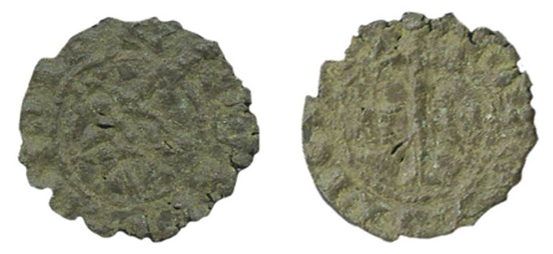 Portugal. Dom Afonso Henriques - Afonso I, "the Conqueror" (1139-1185). Billon Dinheiro. 0.38 gms. Pentagram in circle, rev. Long cross, flanked by V at left and "T" on its side top facing inward, within circle, top broken by cross. Gomes 05.03. Very rare with only a few known. Ragged edge, a few small rents at center. Toned over roughness. About Fine.