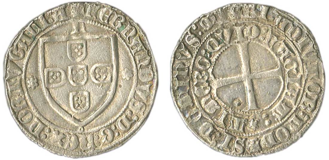 Portugal. Fernando I, "the Handsome" (1367-1383). Tornés de Escudo. Miranda. 3.19 gms. Shield with Arms, rosette either side, small annulet below, rosette, "M" above (the left leg not struck up), all within beaded circle; + FERNANDVS: D: G: REX: PORTVGALI. A, rev. Cross in circle, two concentric rings of legend around, pellet in one angle. Gomes 74.03. Rare. Attractive light gray tone with champagne hues. Extremely Fine.