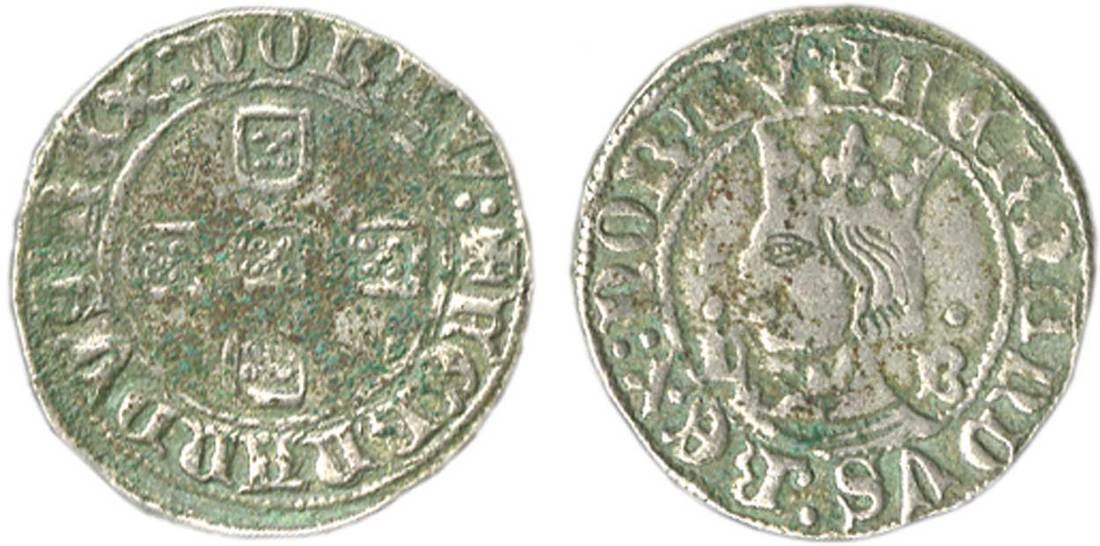 Portugal. Fernando I, "the Handsome" (1367-1383). Billon Meio Tornés de busto. Lisbon. 1.81 gms. Crucifom Arms within solid circle; + FERNANDVS: REX: PORTV:, rev. Crowned bust left, L-B, pellet left and right, and small cross left; + FERNANDVS: REX: PORTV:. Gomes 60.05. Extremely Rare legend variety. Some light deposits. About Very Fine.