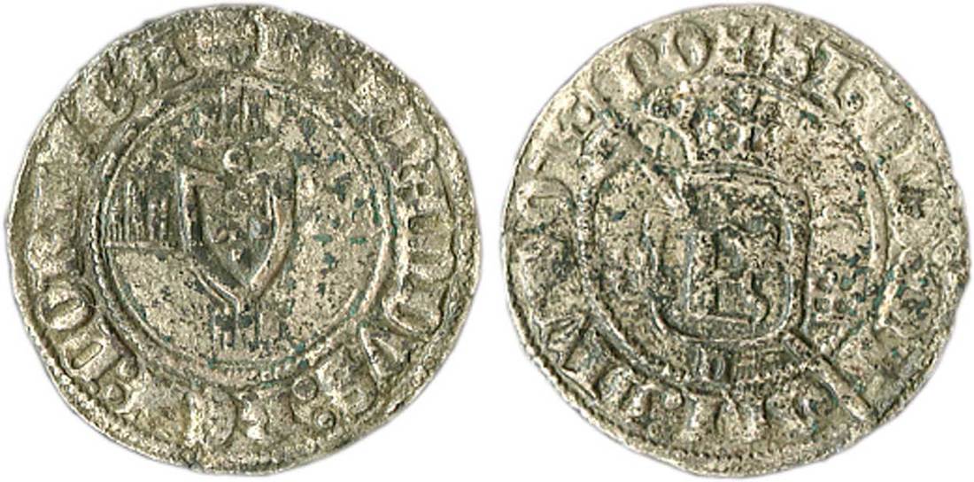 Portugal. Fernando I, "the Handsome" (1367-1383). Billon Grave. Lisbon. 1.98 gms. Portuguese Arms, castle in each angle, pellet above, rev. "F" on crowned shield, lance crossed behind, cross either side, "L" below. Gomes 11.01. Very Fine.