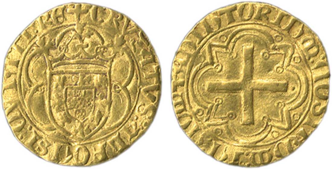 Portugal. Afonso V, "the African" (1438-1481). Cruzado. 3.49 gms. Crowned Arms in cartouche of five arcs, rev. Cross in ornamented quadrilobe with triangular angles. Fr.9, Gomes 31. Very scarce. Good Very Fine for type.