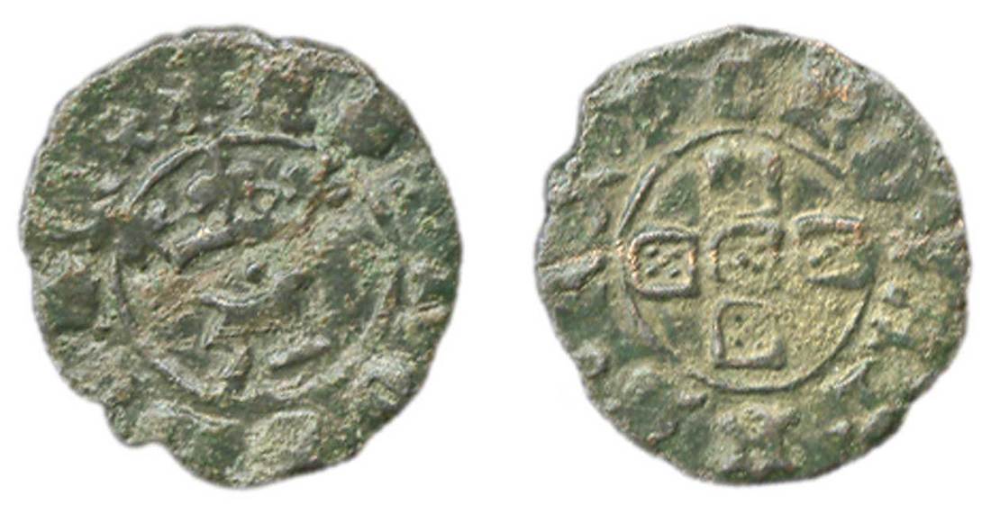 Portugal. Afonso V, "the African" (1438-1481). Copper Meio Real preto. Lisbon. 1.10 gms. Crown over pellet and "A", annulets within crown, rev. Cruciform Arms within circle. Gomes--. Extremely Rare variety. Olive green. Fine.