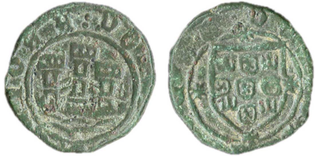 Portugal. Afonso V, "the African" (1438-1481). Ceitil. A. 2.65 gms. Castle with three towers, ramparts, waves below, "A" in upper right field by tower, rev. Shield with Arms, Jerusalem cross in each angle, within circle. Gomes 11.06. Extremely Rare and one of only 2-3 known. Attractive olive-green patina. Extremely Fine and Choice.
