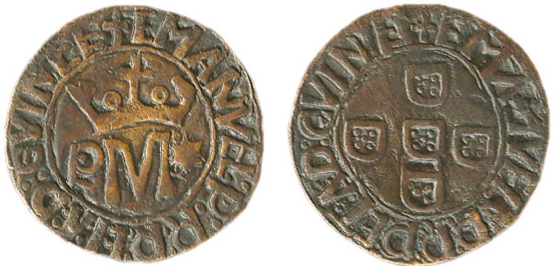 Portugal. Manuel I, "the Fortunate" (1495-1521). Copper Meio Real. Porto. 4.48 gms. Crowned "M" flanked by "P" at left, and six-point star at right, rev. Cruciform Arms of five shields within circle. Gomes 07.03. Attractive deep tan-brown. Extremely Fine.