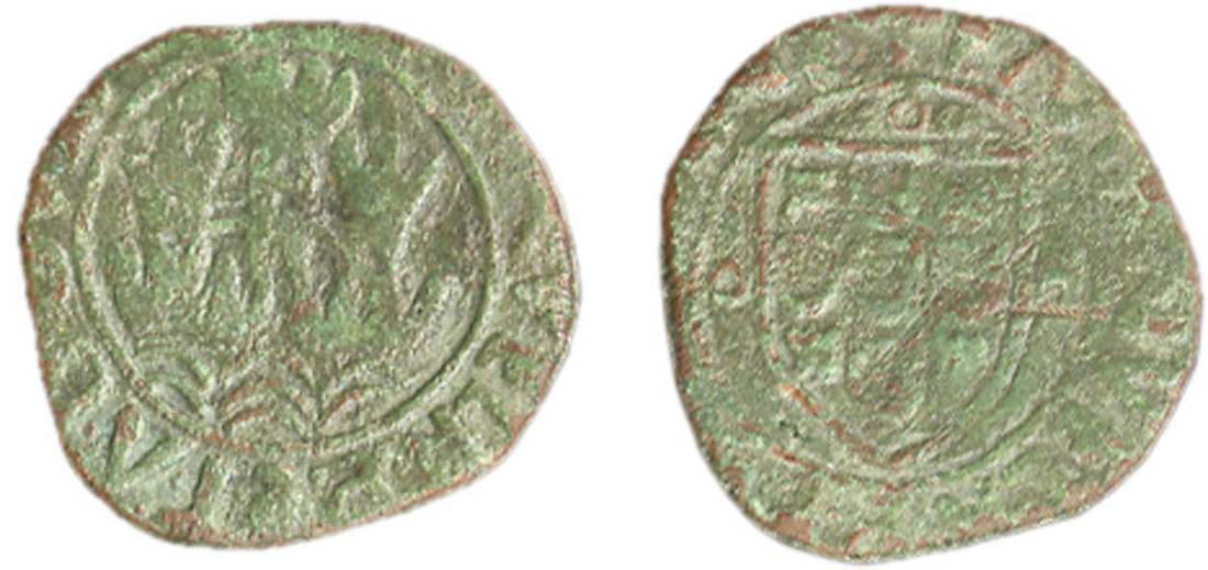 Portugal. Manuel I, "the Fortunate" (1495-1521). Ceitil. 1.94 gms. Three towers, bipartite wall, waves below, rev. Arms on shield, annulet left, right and above. Gomes 01.01. Very Rare variety. Green patina with burgundy hues. Good Fine.