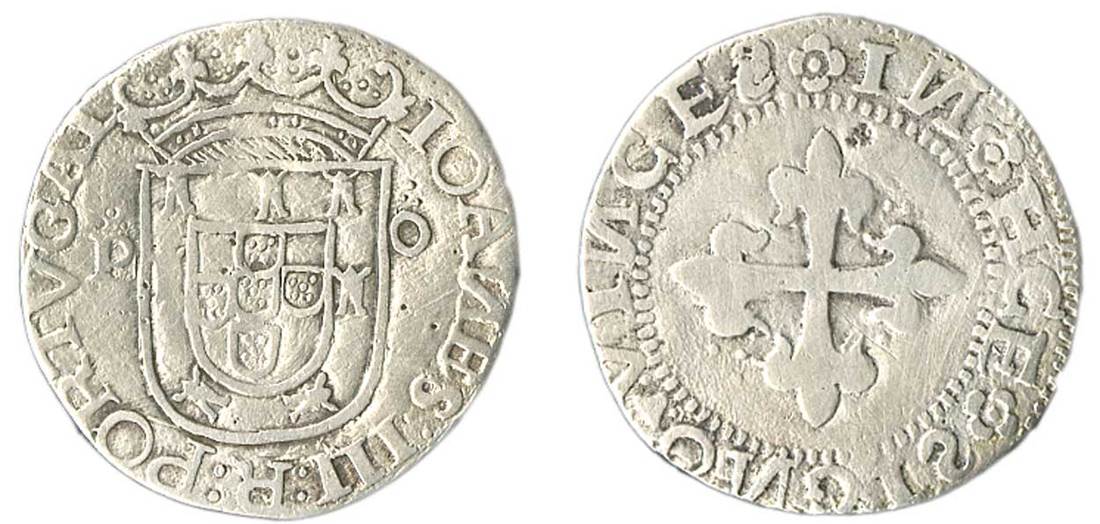 Portugal. João III, "the Pious" (1521-1557). Tostão. Porto. 8.03 gms. Crowned Arms, P-O (triplex of pellets over each); IOANES: III: R: PORTVGAL (the "N" retrograde), rev. Cross fleury in denticled circle; IN (rosette) HCE (rosette) SIGNO.(triangle). VINCES (rosette) - the "S"s and "N"s retrograde. Gomes 137.0(4). Extremely Rare legend variety and possibly unique. Tiny banker's mark (?) reverse field and some old hairlines. Very Fine.