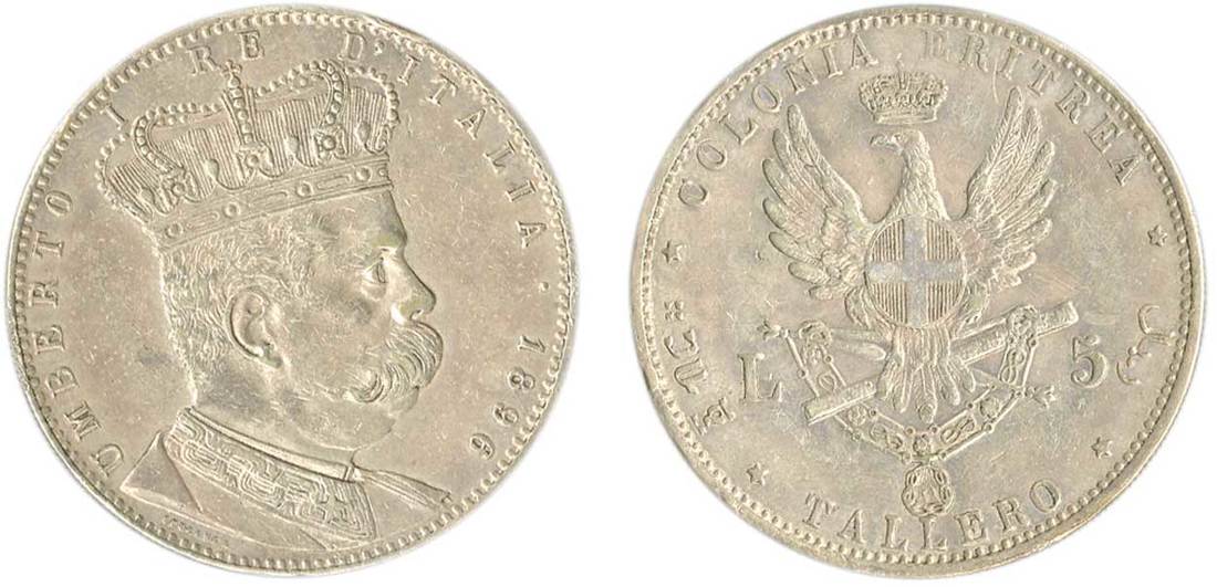 Eritrea. Umberto (1889-1900). 5 Lire - Tallero, 1896. Crowned bust r., rev. Crowned Eagle and Arms, Order suspended below. KM 4. Pale slate gray over some reverse scratches in right field. Extremely Fine.