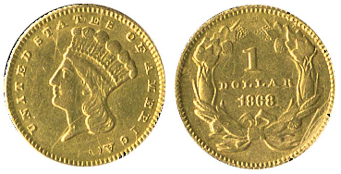 1868 Gold Dollar Type III. Almost Uncirculated details, light scratches.