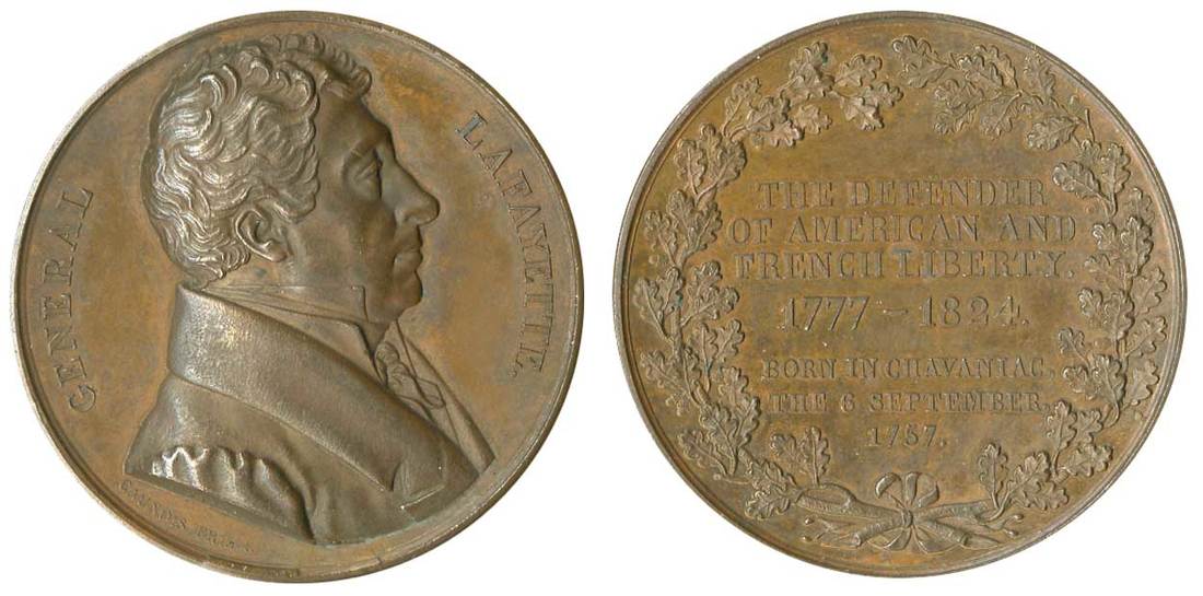 General Lafayette - The Defender of American and French Liberty, 1824. 46.7 mm. By François Caunois. French-made medal. Civilian bust of Revolutionary hero right, rev. Seven-line legend in wreath. Plain edge. Callignon 412, Oliver 35. Dark chesnut-brown. About Uncirculated.