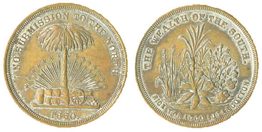 Wealth of the South, 1860 Token. Fuld 511/514B. R5. Brass. Cannon and mortars beneath radiant palm; NO SUBMISSION TO THE NORTH 1860, rev. Rice, tobacco, sugar cane and cotton plants; THE WEALTH OF THE SOUTH. Produced by Benjamin True and struck in Covington, Kentucky - across the river from Cincinnati - by the prolific John Stanton this token today is one of the most popular Civil War tokens. May have once been silvered. Sharp Extremely Fine.