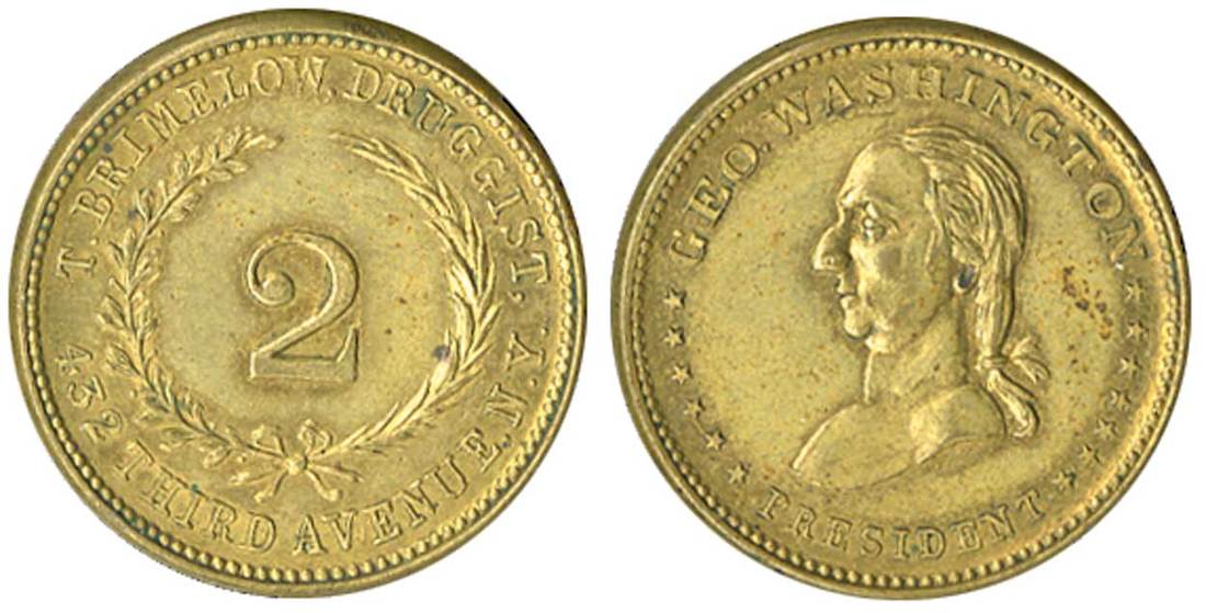 New York City. T, Brimelow, Druggist. Civil War Storecard. Brass. Cf.630K-2a for reverse. "2" within wreath; T. BRIMELOW, DRUGGIST 432 THIRD AVENUE, N.Y. around, rev. Washington bust left. Rare variety. Decent lustre. Uncirculated.