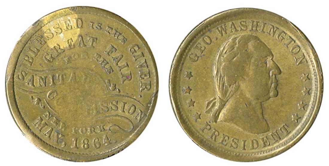 New York City. Great Fair for the Sanitary Commission. Civil War Storecard, 1864. Brass. 630BJ-1b. R8. With Geo. Washington President reverse. Bright spot upper obverse and a few minor edge tics, typical weakness reverse center. About Extremely Fine. Very rare issue and one of the key tokens to the whole New York storecard series. An MS-62 example brought $1,320 in a May 2004 Steve Hayden Auction.