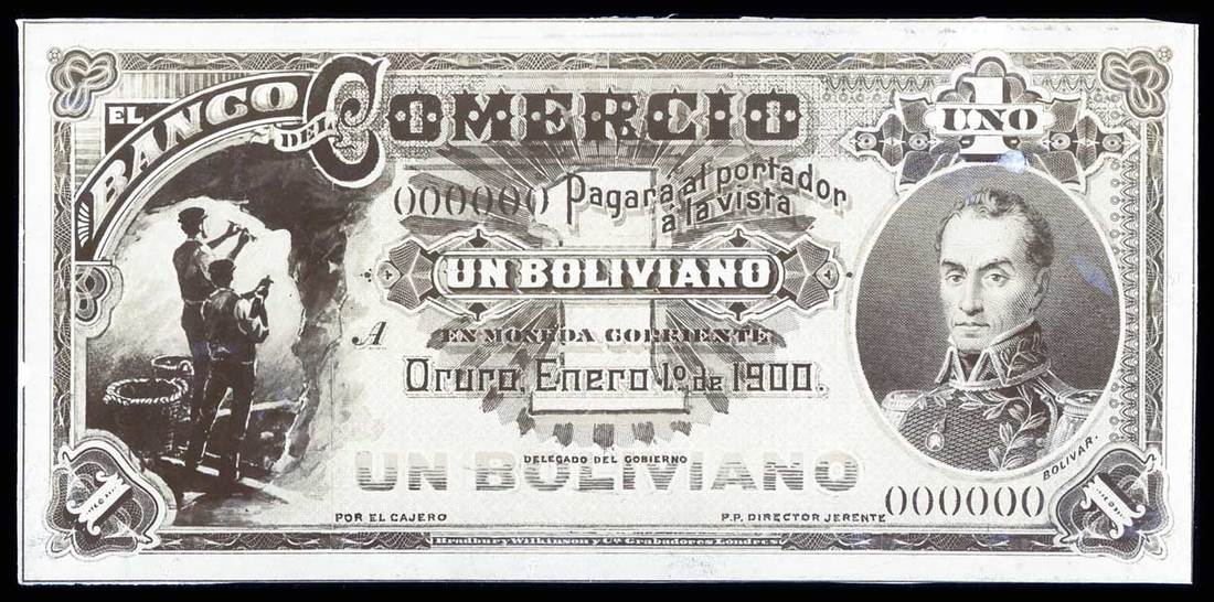 While all are very similar to the final adopted designs, there are many subtle variations. (For example, compare the counters in the upper corners of the 10 Bolivianos to the adopted design.) While the Standard Catalog speculates that a 100 Bolivianos was issued, this auction lot offers proof that it was not. No archive photograph of that type is present, and a hand written note (included with this lot) indicating the colors to be used for "Comercio Notes. 4/4/1900" does not mention the 100 Bolivianos denomination. Some are faded. Should be viewed. Sold as is, no returns. [11]