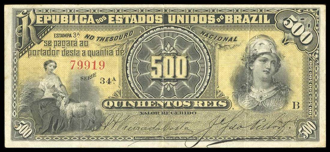 Brazil. Thesouro Nacional. 500 Reis. Estampa 3A (1893). P-1b. Woman seated lower left petting sheep, helmeted, cuirassed woman at right. Very light stain in margin, otherwise Good VF.