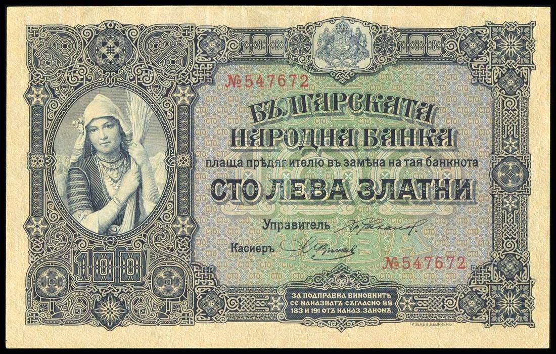 Bulgaria. Bulgarian National Bank. 100 Leva Zlatni.. ND (1917). P-25a. Woman with sheaf of wheat at left, supported Arms on back. Scarce. Extremely Fine, nice paper quality and snap.