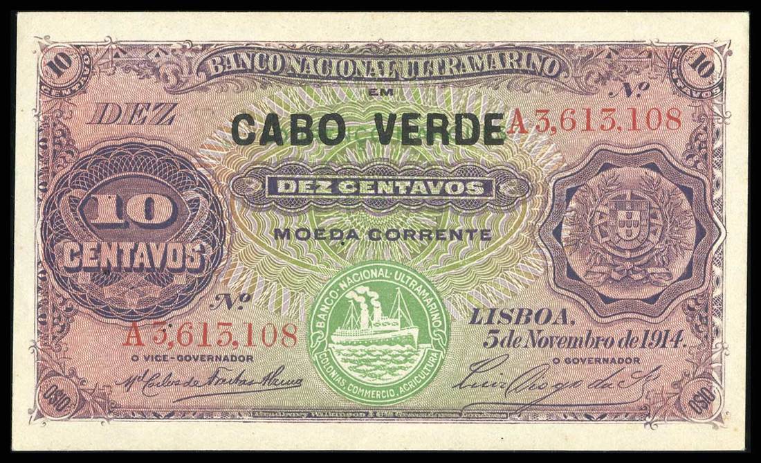 Cabo Verde. Banco Nacional Ultramarino. 10 Centavos. 1921 Provisional issue (old date 1914). P-20. Purple on multicolor underprint. Arms at right, green steamship seal lower center. Black "CABO VERDE" overprint. Choice Crisp Uncirculated, excellent embossing, fresh and original, quite scarce so nice.