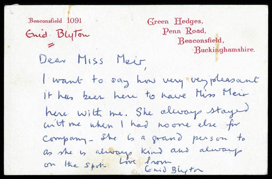 Blyton, Enid (1867-1968). English children's book writer. Over 600 million books sold. Best remembered for her Noddy, Famous Five, and Secret Seven series. 3 ½" x 5" card, signed. No date. To "Miss Meir." Written from Green Hedges, Beaconsfield, Buckinghamshire. > "…how very very pleasant it has been here to have Miss Meir with me…"