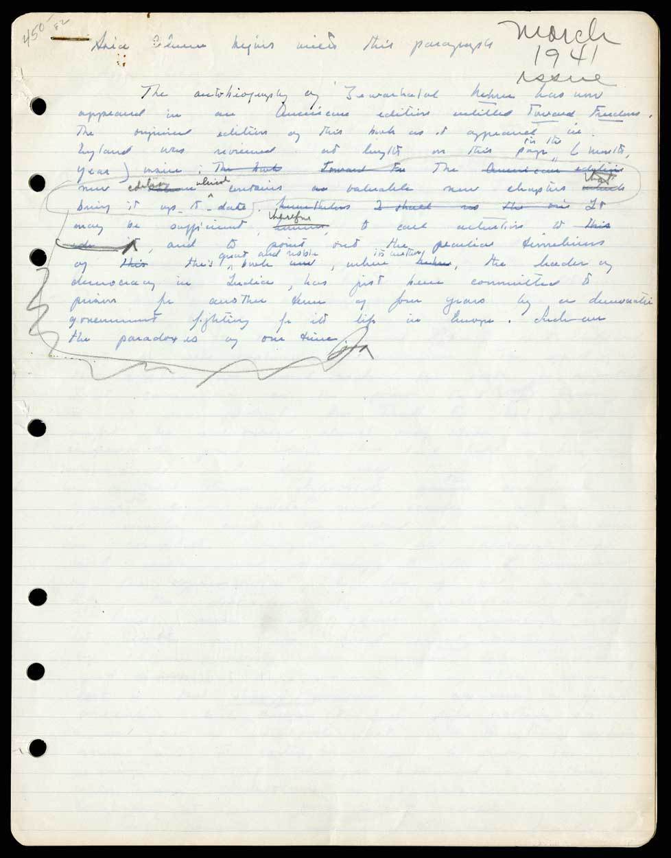 Buck, Pearl S. (1892-1973). American novelist, critic, and humanitarian activist; raised in China, she is best known for her stories and novels set there. She was awarded the Pulitzer Prize for her novel The Good Earth and, in 1938, the Nobel Prize for Literature. Scarce Autograph Manuscript Signed twice"P.S.B." once in pen and once in pencil, 8-112 pages, 4to, no place, ca. March 1941. A series of book reviews for Asia magazine. First comes a brief note on "The autobiography of Jawaharlal Nehru ... entitled Toward Freedom ... the new edition, which contains a valuable new chapter that brings it up to date ... " With Buck's "Asia Column," a book review, in which she writes, "Out of the Night, by Jan Valtin, is a book like none other that has ever been written. It is difficult to define exactly its unique quality and significance, but it has both these. The material is not in itself new. It is, superficially, the story of a German communist who was sent to work in underground activities for communism in many countries ... among which were the United States and China. The book contains no propaganda. It is the story of a man so shaped by the circumstances of his time ... that he was captured by communism ... [For Communism] might be substituted almost any other impersonal power which has laid hold of human individuals and used them and dehumanized them ... " After a discussion of the book's contents, she concludes that "It all makes a book which everyone ought to read who believes in the dignity of the individual ... " She next turns to "Workers Before And After Lenin by Manya Gordon ... an examination into the conditions of the Russian labor for the last fifty years, and a comparison of the conditions of working people in that country now ... The book begins with an account of the gains which labor was making before the revolution ... " Rebelling against oppression and exploitation, " ... The unions did not at once realize that they would be in exactly the same relation to the Soviet government as they were to their former capitalist employers ... with one difference. Under the old system they could strike and arbitrate and negotiate. Under the new regime they lost all such rights ... " She writes of the author's conclusion, " ... If she is right and if the people of Russia are once more fighting for liberty ... it brings them back into the world of peoples ... " She reviews two other works more briefly, "Chinese Homes and Gardens ... a joy to possess ... " and "The Maori People Today," a collection of symposium essays. She notes that " ... it has been taken for granted that the white man in New Zealand has treated the Maori with unusual justice and mercy ... " but the collection shows there was " ... no unusual goodness on the part of the white conquerors ... " Buck signs her initials after each of these last two reviews, the first in pencil. With numerous pencil and ink revisions. All pages stapled together in upper left corner. Binder holes at left edge. Age-toned, especially at edges, with some breaks in binder holes of first page, otherwise in very good condition.