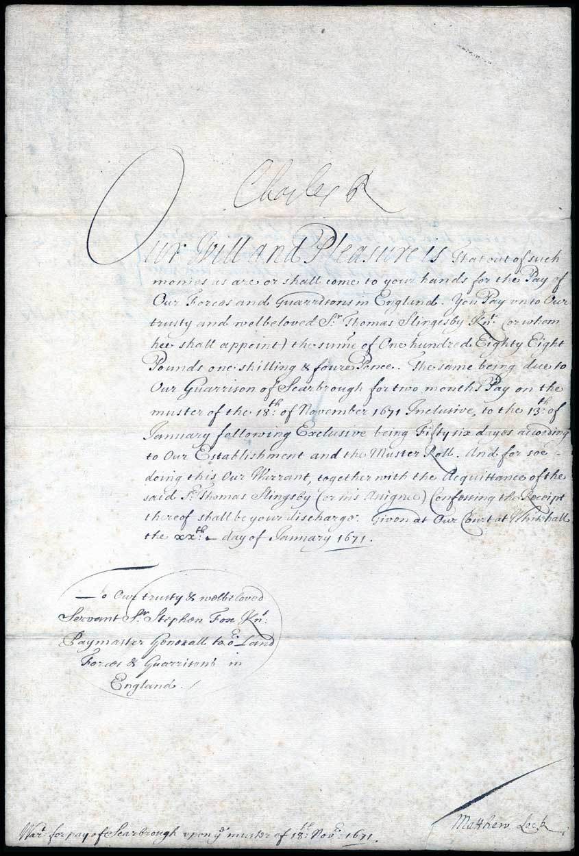 Charles II. Stuart King of England, Scotland, and Ireland (1660-1685). LS, 4vo. July 27, 1666. Signed "Charles R" at the top. Sir Thomas Slingesby, Knight, signs one of the back panels. "Our will and Pleasure is that out of such monies as are or shall come to your hands for the Pay of Our Forces and Garrisons in England you Pay on to Our trusty and welbeloved Sr. Thomas Slingesby, Knt. (or whom he shall appoint) the sum of One hundred and Eighty Eight Pounds one shilling & foure[sic] Pence. The same being due to Our Guarrison[sic] of Scarborough for two months Pay on the muster of the 18th of November 1671…Given at Our Court at Whitehall…" This document was signed during the Second Dutch War. By 1666 France and Denmark were allies of the Dutch, and an attack on the Thames was to become a reality a year later. Some light age toning is present. There is a long fold split, and a small tear in the bottom margin, but otherwise quite nice. Another great opportunity to obtain an important Royal document.