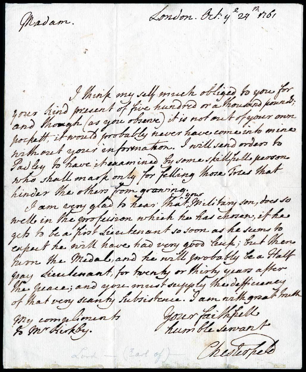 Chesterfield, Philip Dormer Stanhope, 4th Earl (1694-1773). British Statesman and man of letters. ALS, one page, 4to, London, October 24, 1761. To Mrs. Kirkby, sending thanks: