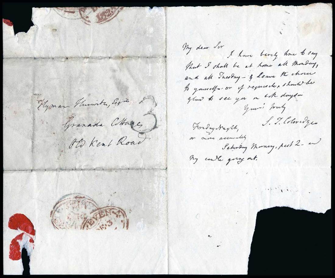 Cottage, Old Kent Road. With integral address leaf bearing blurred postal markings and remains of seal. n.p. [probably Highgate], n.d. [postmarked 1825, possibly 3 February]. A friendly letter, saying "I have barely time to say that I shall be at home all Monday, and all Tuesday - I leave the choice to yourself - or if agreeable I should be glad to see you on both days - " After his signature Coleridge charmingly dates the letter "Friday Night, or more accurately Saturday Morning, past 2 - and my candle going out." Coleridge lived in the Highgate family home of James Gillman from 1816 until his death; he received there affectionate attendance and care and was able to reduce his dependence on opium. Hyman Hurwitz (1770-1844) was a distinguished Polish Jewish scholar who ran a Jewish school in Highgate, where he became a friend and neighbor of Coleridge.