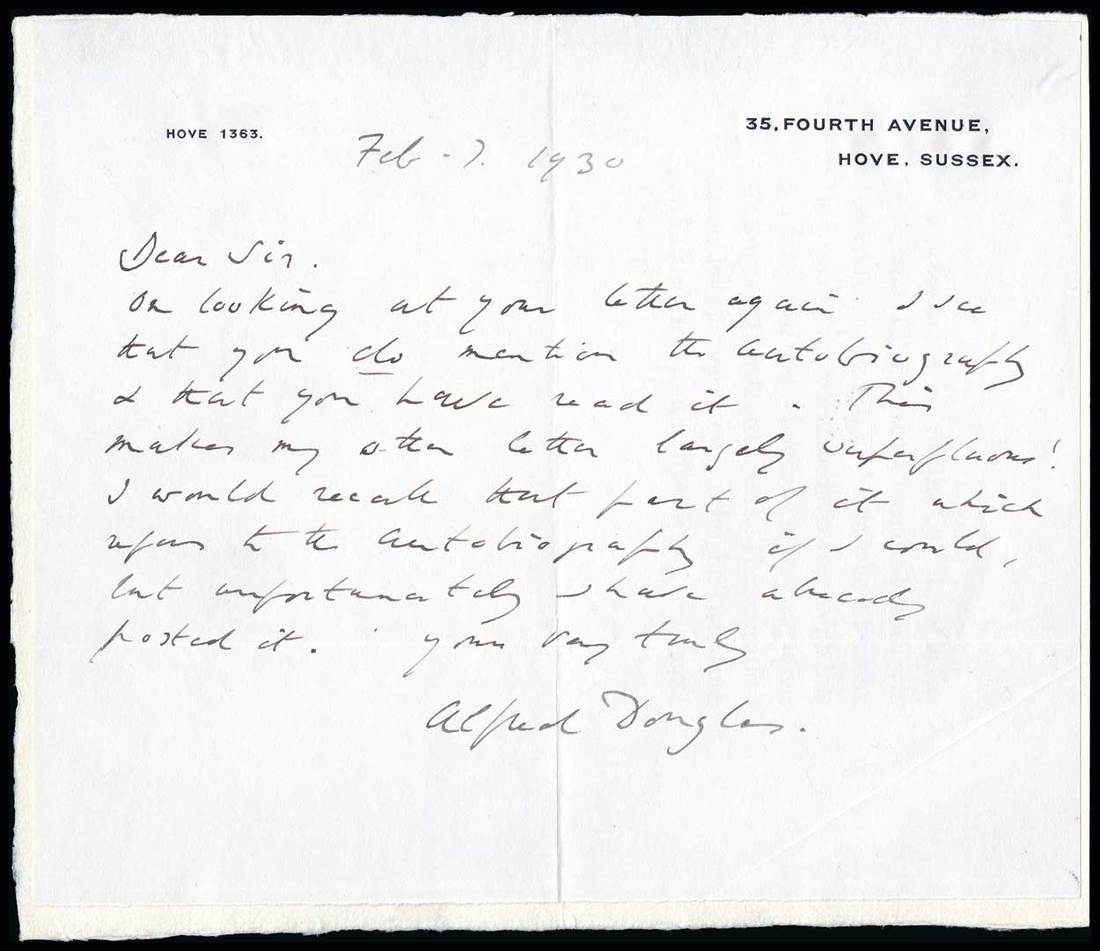 "Dear Sir, On looking at your letter again I see that you do mention the autobiography & that you have read it. This makes my other letter largely superfluous! I would read that part of it which refers to the autobiography if I could, but unfortunately I have already posted it. Yours very truly, Alfred Douglas." (The autobiography referred to in the letter was published in 1929.) Douglas met Oscar Wilde in 1891 and began an affair that would garner world-wide attention. In 1894, the Robert Hichens novel The Green Carnation was published. Based on the relationship of Wilde and Douglas, it would later be one of the texts used against Wilde during his trials in 1895. Douglas has been described as spoiled, reckless, insolent and extravagant. He and Wilde often argued, broke up, and then reconciled. Alfred's father, Lord Queensberry publicly insulted Wilde by leaving him a business card that said "For Oscar Wilde posing as a somdomite(sic)." Wilde had him arrested, and charged with criminal libel. Douglas lost the case, and had to pay Queensberry's legal fees, which left him bankrupt. Wilde landed in prison, charged with criminal sodomy and "gross indecency."