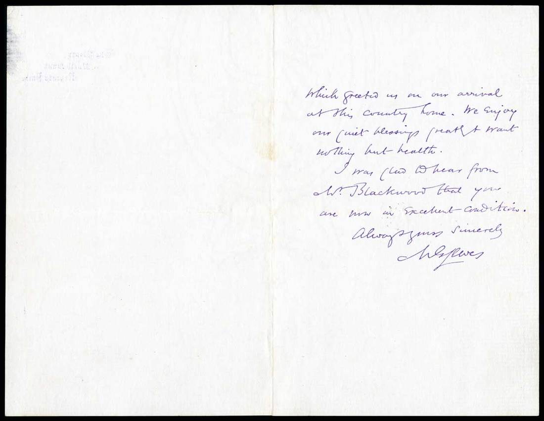 Eliot, George (Mary Ann Evans Lewes, 1819-1880). English novelist, journalist, and translator. One of the most important writers of the Victorian era. ALS, two pages, 8vo. The Heights. Witley, Godalming. June 29, no year, but George Eliot and Henry Lewes bought The Heights in late 1876. The original address, The Priory, North Bank, Regents Park is crossed out, as well as the second paragraph. "Dear Mr. Langford, I am quite willing that the extract should be made from 'Silas Marner' for the Sixth National Reading Book. Will you oblige me by sending a copy of 'Middlemarch' with a copy of Smith & Elder's 'Rimola' to Madame Mario….Thanks for your friendly wishes which greeted us on our arrival at this country home. We enjoy our quiet blessings …want nothing but health. I was glad to hear from Mr. Blackwood that you are now in Excellent condition. Always yours sincerely, M. E. Lewes." George Eliot was the pen name of Mary Ann Evans. Despite the fact that female authors were published under their own names during her lifetime, Eliot felt she would not be taken seriously unless her stories appeared to have been written by a man. There is a stain on the first page, but the second page which has the signature is pristine.