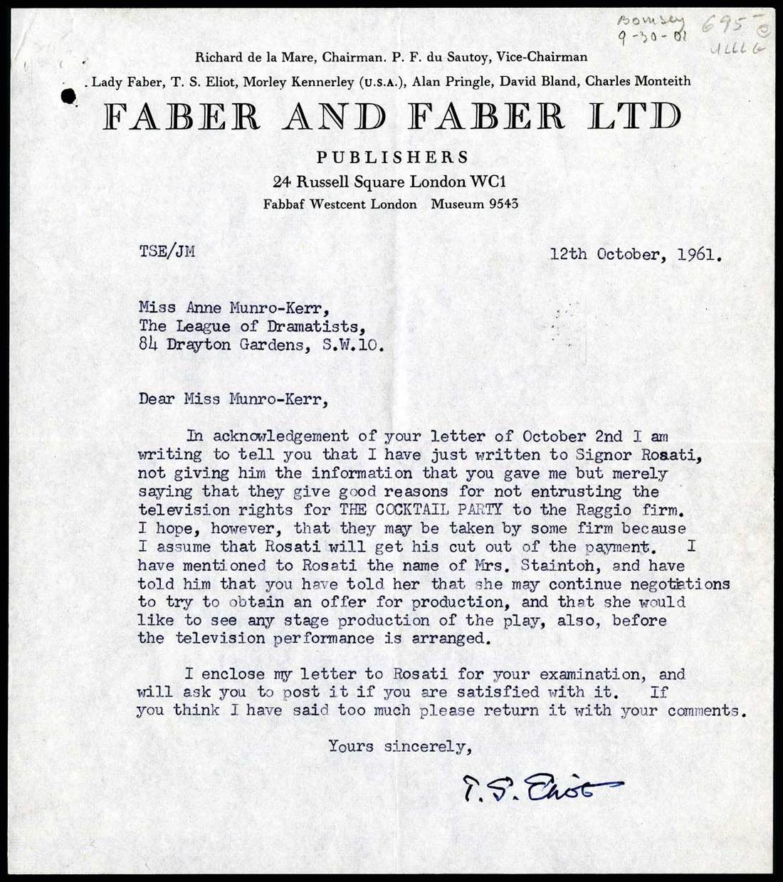 Eliot, Thomas Sterns (1888-1965). American-born British poet, playwright, and literary critic. TLS, one page, 4vo. On stationery of Faber and Faber Ltd. Publishers, London, [England], October 12, 1961. To Miss Anne Munro-Kerr. Perhaps the most influential English-language poet of the 20th Century, Eliot won the 1948 Nobel Prize in Literature, and is still regarded as "one of the most daring innovators of twentieth-century poetry." Eliot discusses television rights for "THE COCKTAIL PARTY." Signed "T. S. Eliot."