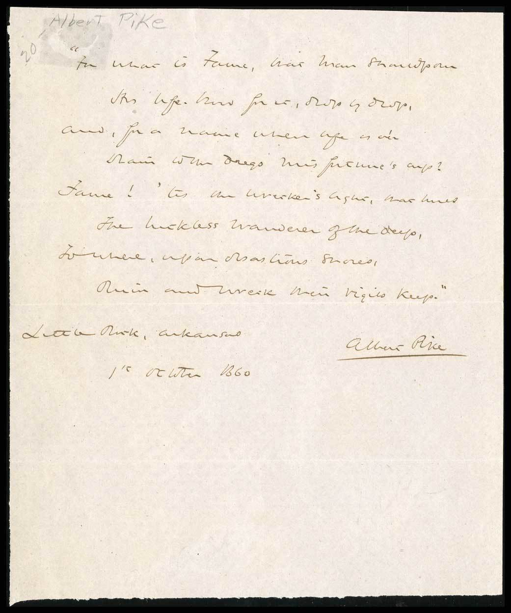 Pike, Albert (1809-1891). Confederate military officer, writer, poet, attorney. One of very few Confederate officers buried in Washington, D.C. AQS. 8vo. October 1, 1860. Little Rock, Arkansas. Nine lines from his poem To Ambition, in his own hand.