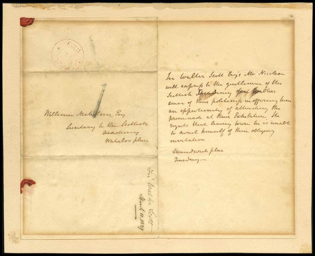 "Sir Walter Scott begs Mr. Nicholson will express to the gentlemen of the Scottish Academy Sir Walters sense of their politeness in offering him an opportunity of attending the promenade at their Exhibition. He regrets that leaving town he is unable to avail himself of their obliging invitation."