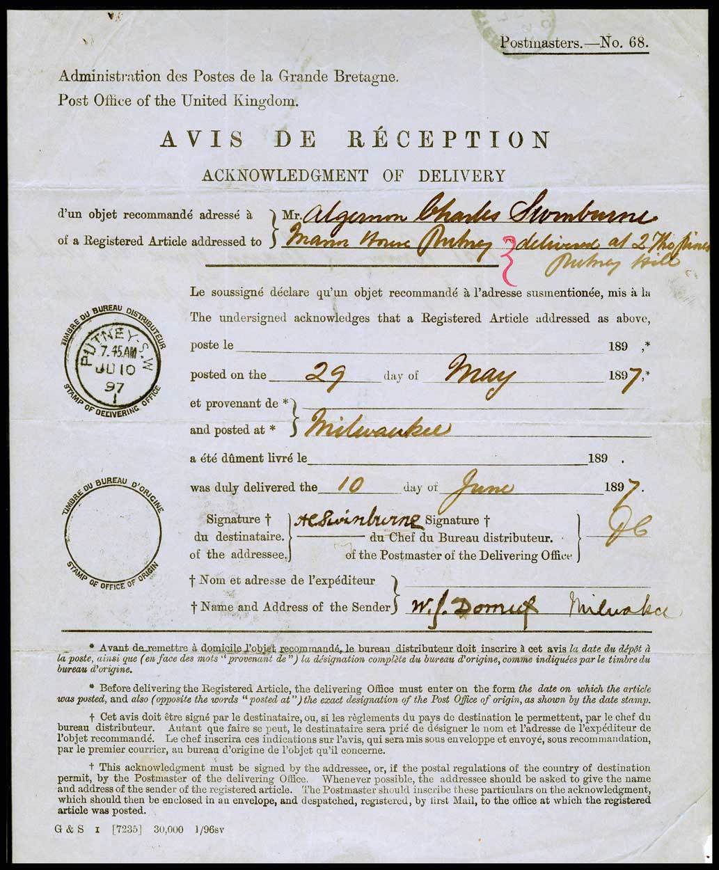 Swinburne, Algernon Charles (1837-1909). English poet, playwright, novelist and critic. Nominated six times for the Nobel Prize. DS. 4to. Putney, S. W. July 10, 1897. From W. Domut, Milwaukee. Acknowledgment of Delivery receipt. Mounted and matted. A small piece missing from the lower right corner.