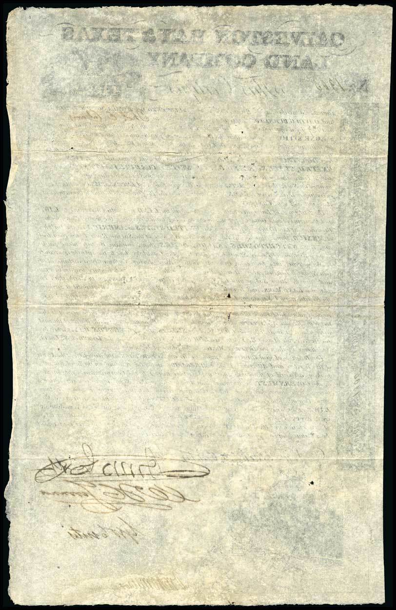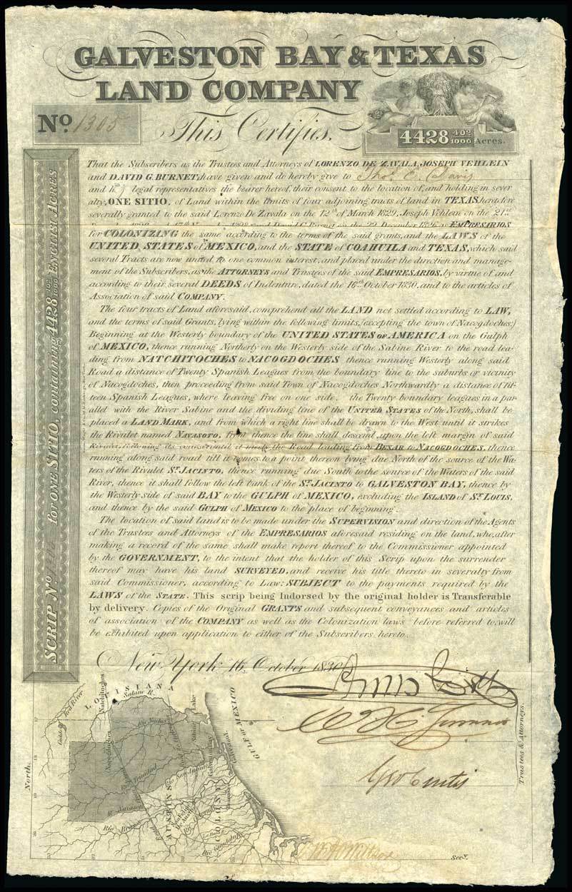 The Galveston Bay & Texas Land Company was founded in order to promote the colonization of lands, located immediately to the east of the Austin Colony between the San Jacinto and Sabine Rivers. The price was five cents an acre, but the certificates were of little worth and, perhaps fraudulent. A great piece of early Texas history.