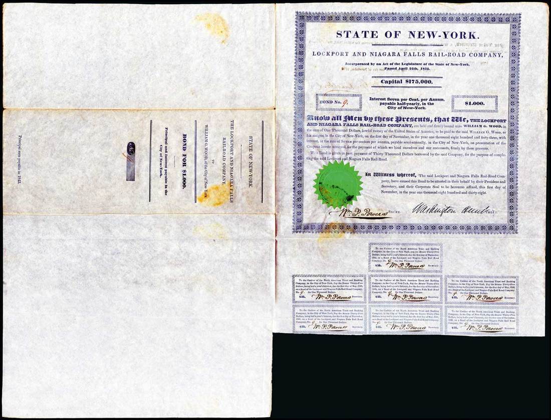 Lockport and Niagara Falls Rail-Road Company (New York) 1838. No.9. $1000 7% Completion Bond. All green. Railroad car on the embossed corporate seal. Seven coupons attached below. Cox reports only six examples. Signed by Washington Hunt as president. Issued, uncancelled. Light stain on the seal, otherwise Very Fine+.