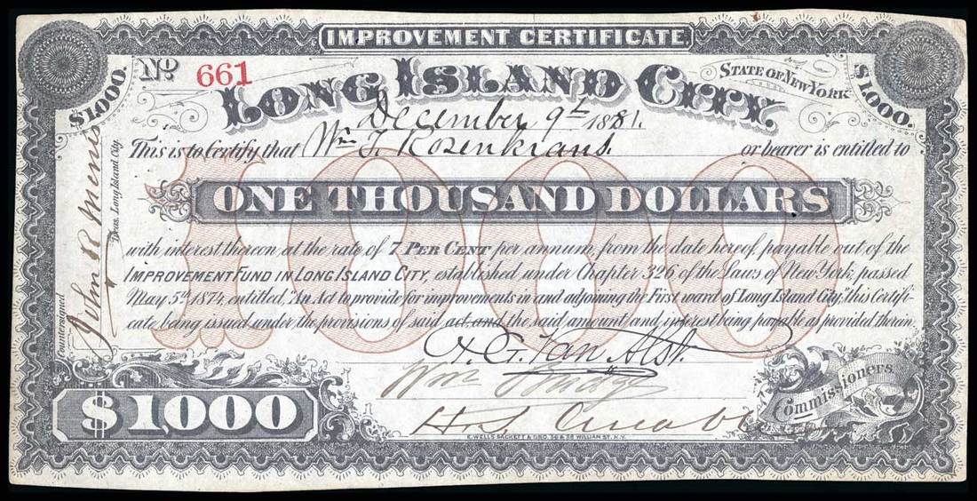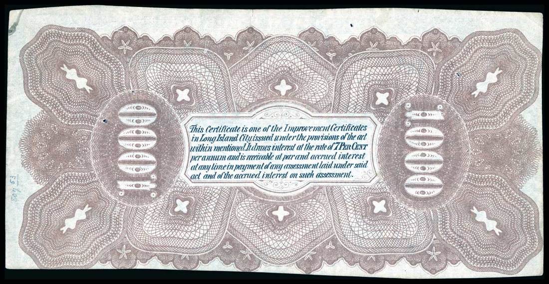 Long Island City 7% Improvement Certificate. $1000. 1881. Brown $1000 under print and back, ornate borders. E. Wells Sacket & Bro. printer. Bank note size, and may possibly have circulated. Issued, uncancelled. Almost Uncirculated, with a corner stain.